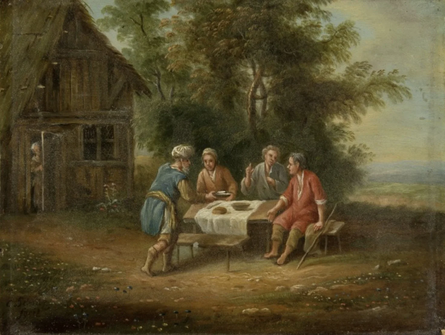 She grows so animated as she tells me the story… sometimes tossing her long dark hair over her shoulder. I love her laugh, the sparkle in her eyes; she even giggles at parts of the story. She tells me how people made statues to the Sun God and the Moon God…the Fire God. how Abraham asked, since the statues did not speak, did not answer questions—why did people believe in them? Abraham, she remarks, is a man who thinks for himself. He takes a pick-axe (how did she know that word? Ah, now I remember, it was in the story about Ajah) and smashes all the stone idols. Then the evil cruel king Nimrod (she pronounced most charmingly, Nimrood) orders his soldiers to build a great bonfire to burn this infidel, and as the soldiers light the pyre, two angels – and she gestures upwards— rise out of the flames to bear Abraham aloft. Ascension. I found an image of Abraham in the Genesis version (ch. 18), entertaining three angels, not two, under the shade of a tree, in a painting by an 18th c. Flemish painter. In this painting, Sarah—an old woman— looks shyly at the group outside, from the doorway of a dilapidated wooden house. Sarah’s laugh (when she learns she will bear a child in her old age) is the first recorded laugh in the Old Testament.
